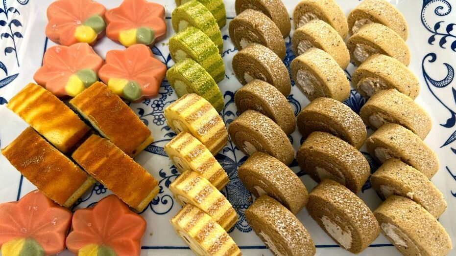 【クリスマス会デザートビュッフェ】体操の後に、ケーキを選んでいただきました。色とりどりのケーキや練り切り、どら焼き、ムースなど、目にも楽しく皆さん喜ばれました。