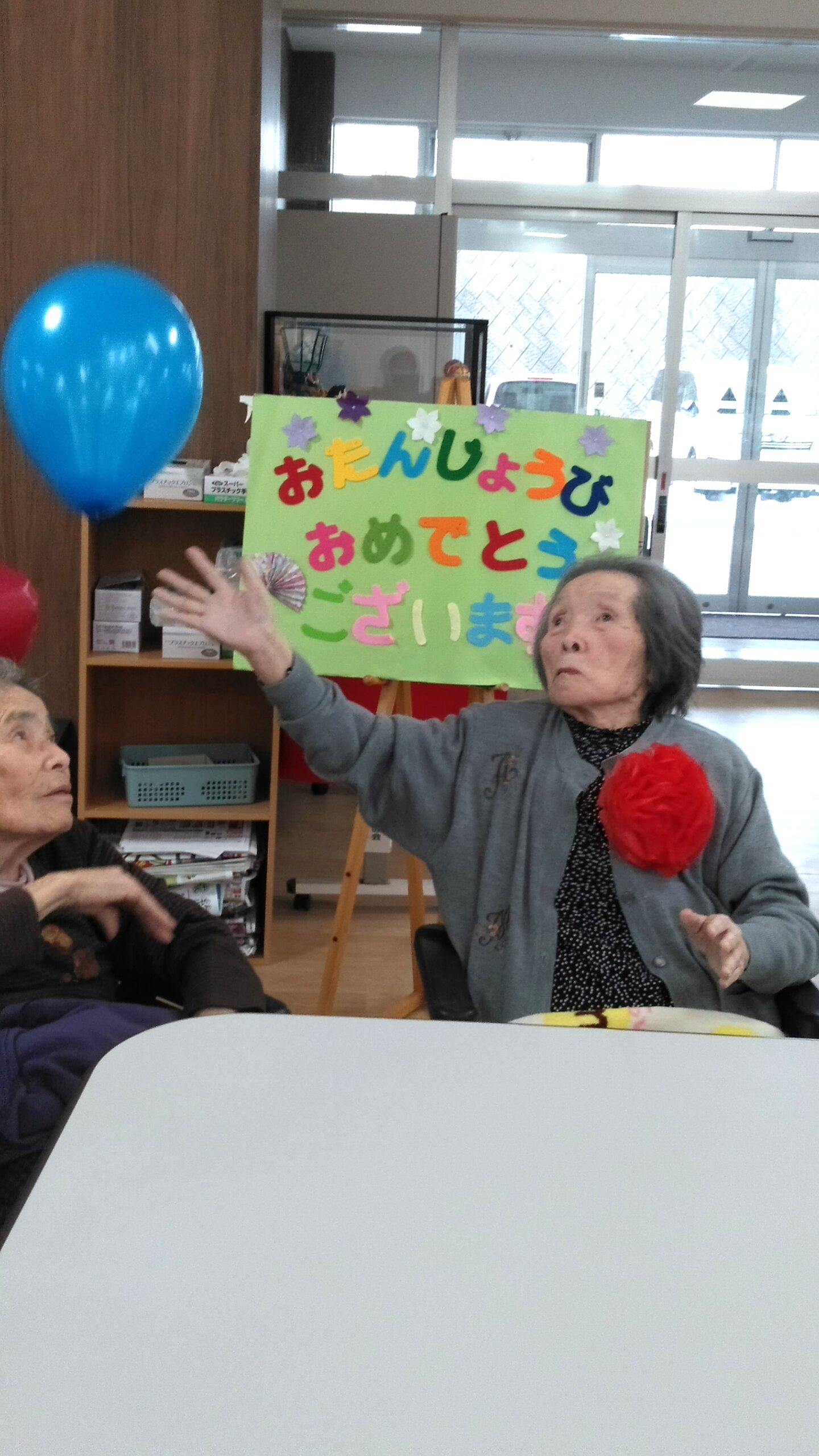 今月の誕生会は風船バレーをしました。目つきが鋭くなったり、動きが機敏になる方もあったり、盛り上がりました。